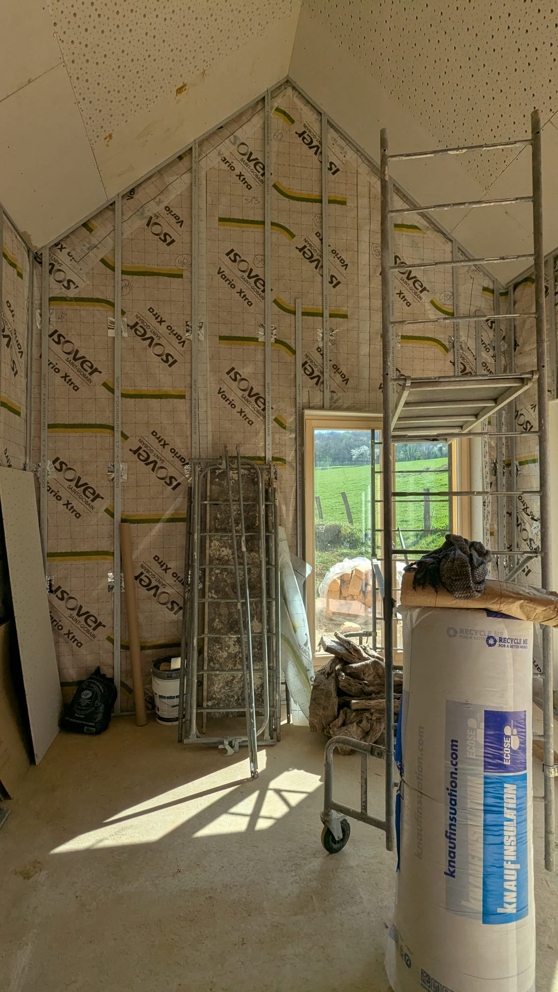 - Isolation intérieure des murs (R ≥ 5,00 m².K/W) et de la toiture (R ≥ 9,00 m².K/W) en laine de bois avec membrane d'étanchéité à l'air,